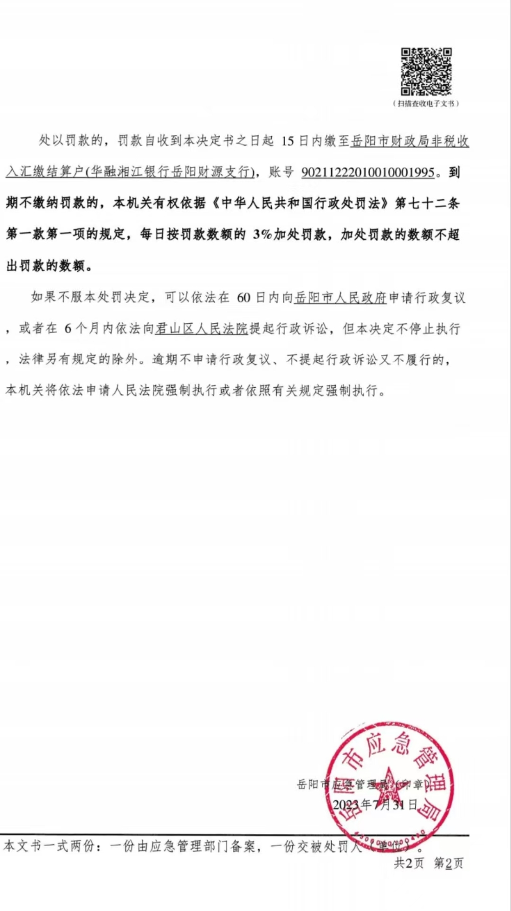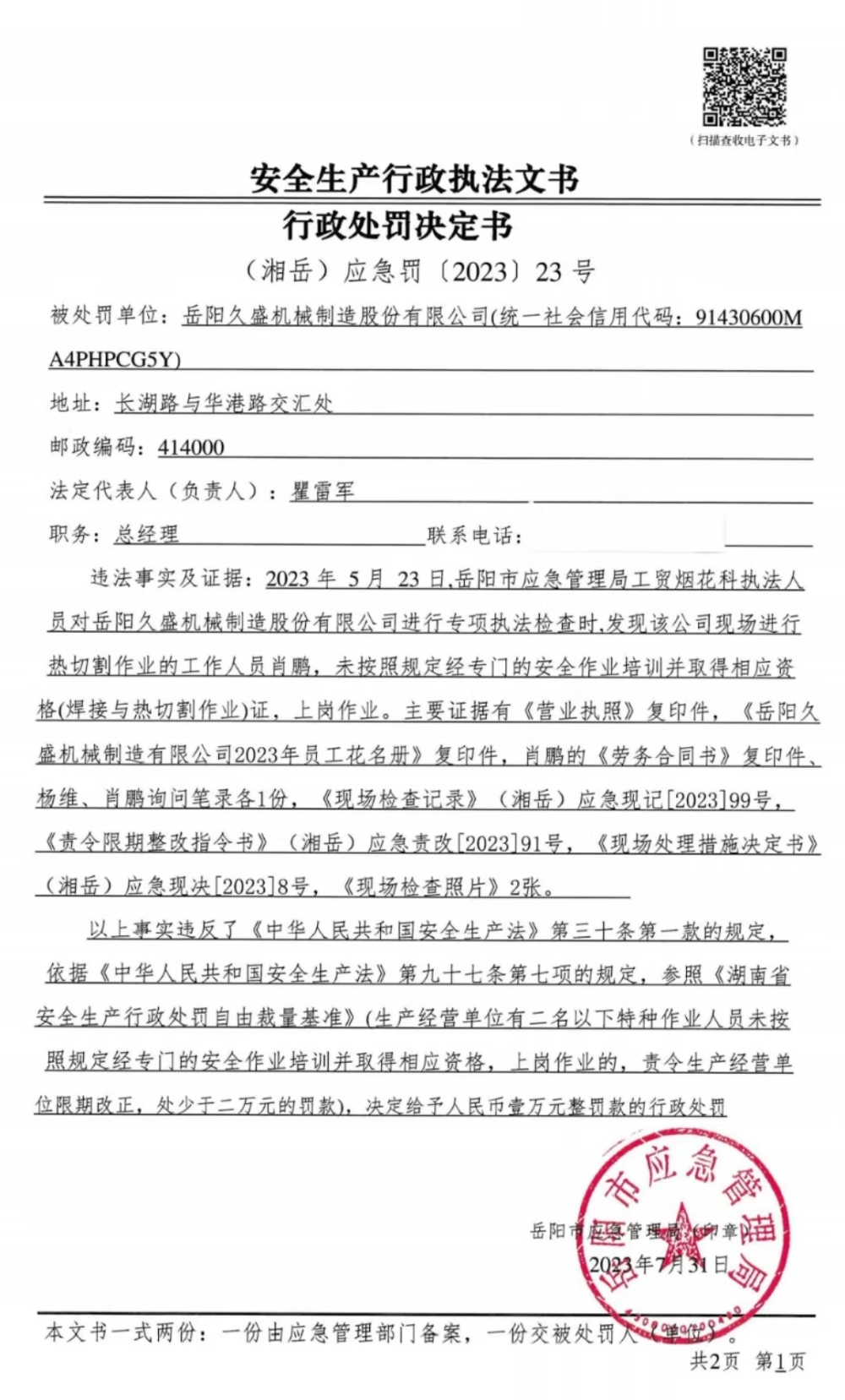 岳阳久盛机械制造股份有限公司行政处罚决定书