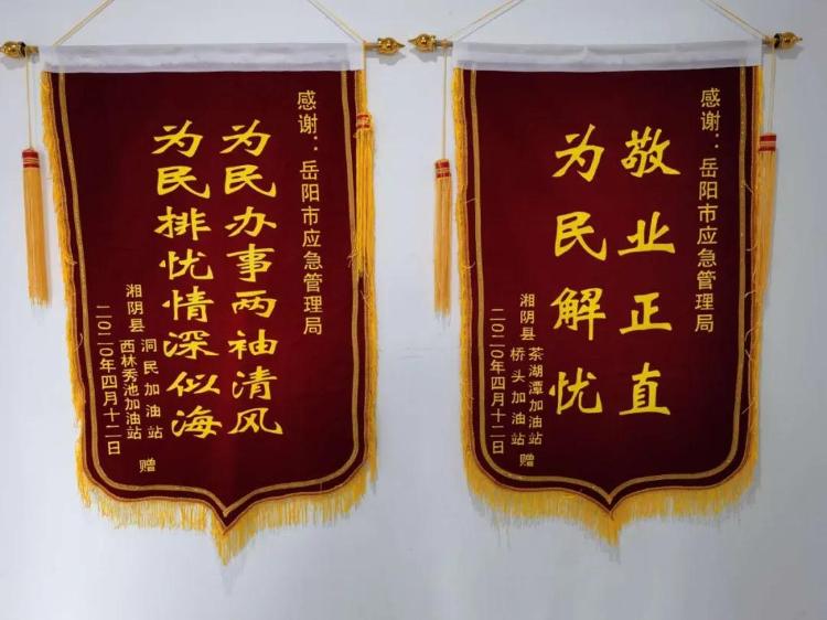 | “感谢岳阳市应急管理局的领导和工作人员热情周到的服务,才使我公司顺利领取到了危险化学品经营许可证。”2020年4月13日下午,湘阴县洞民加油站等四家加油站工作人员专程来到岳阳市应急管理局,送上写有“敬业正直、为民解忧"、"为民办事两袖清风、为民排忧情深似海”的两面锦旗,对岳阳市应急局工作人员认真负责、高效便民的优质服务表示感谢。
