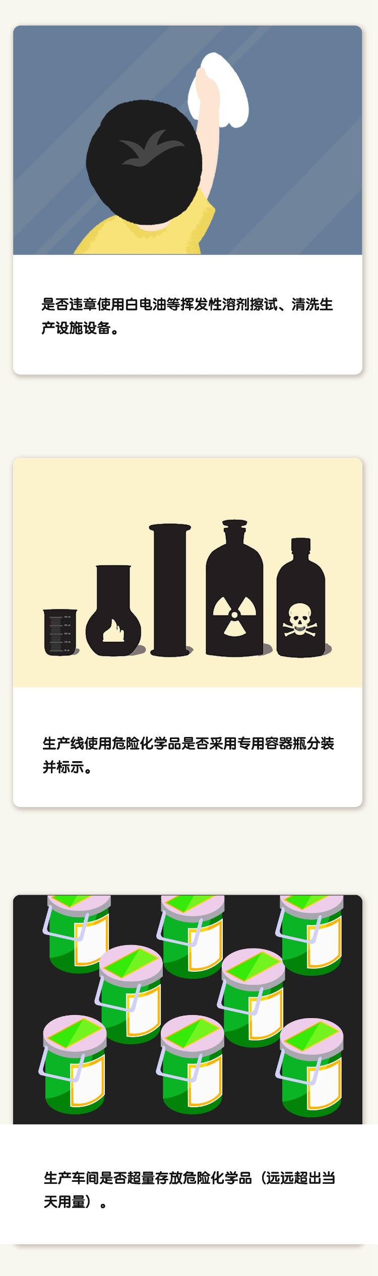 是否违章使用白电油等挥发性溶剂擦试、清洗生产设施设备。