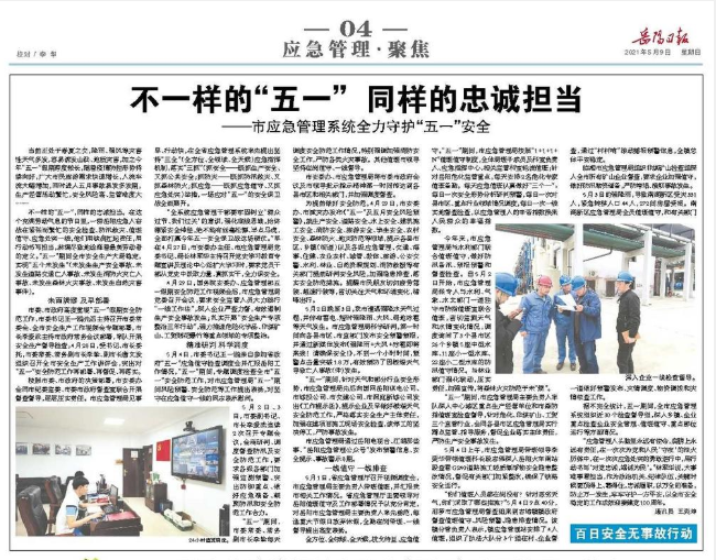 “五一”期间,市应急管理局主要负责人率队深入中心城区重点生产经营单位和市森防指值班室检查督导,针对危化、非煤矿山、工贸三个直管行业,会同各县市区应急管理局实行蹲点监管、指导服务,督促企业落实主体责任,严防生产安全事故发生。